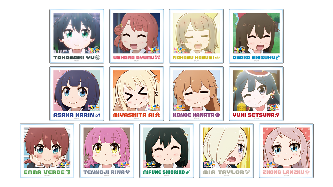 種類 :全13種(高咲 侑、上原 歩夢、中須 かすみ、桜坂 しずく、朝香 果林、宮下 愛、近江 彼方、優木 せつ菜、エマ・ヴェルデ、天王寺 璃奈、三船 栞子、ミア・テイラー、鐘 嵐珠)