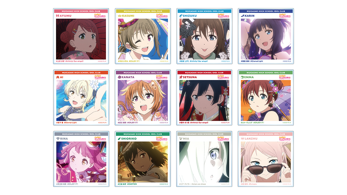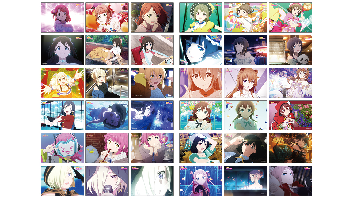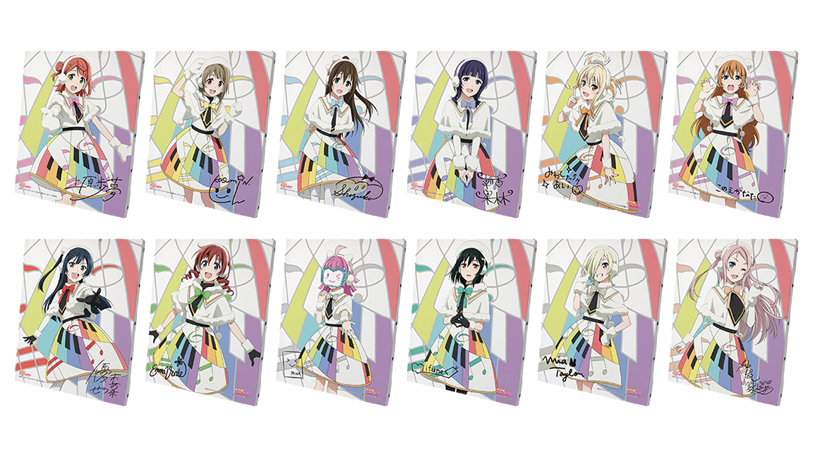 種類 :全12種(上原 歩夢、中須 かすみ、桜坂 しずく、朝香 果林、宮下 愛、近江 彼方、優木 せつ菜、エマ・ヴェルデ、天王寺 璃奈、三船 栞子、ミア・テイラー、鐘 嵐珠)