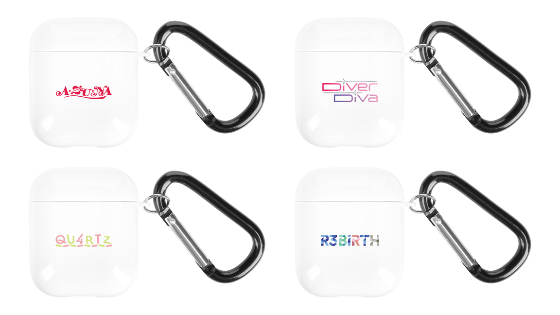 A・ZU・NA、DiverDiva、QU4RTZ、R3BIRTHのロゴと作品ロゴをAirPodsケースに仕上げました。