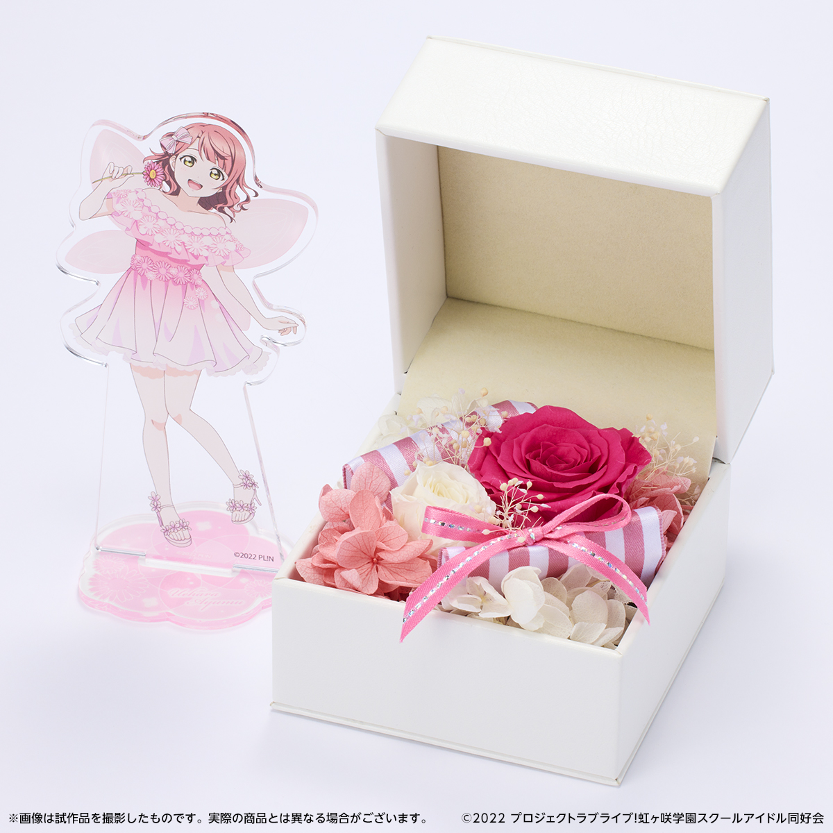 虹ヶ咲のメンバーそれぞれをイメージしたフラワーアレンジメントと、お花の妖精をイメージした華やかでかわいらしい衣装に身を包んだメンバーのアクリルスタンドがセットになった商品です。