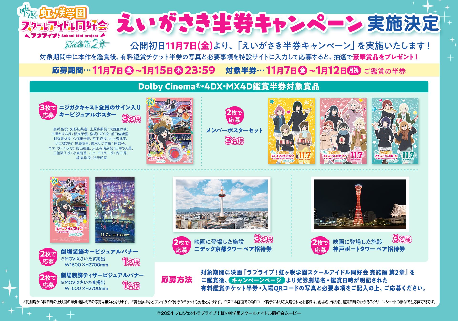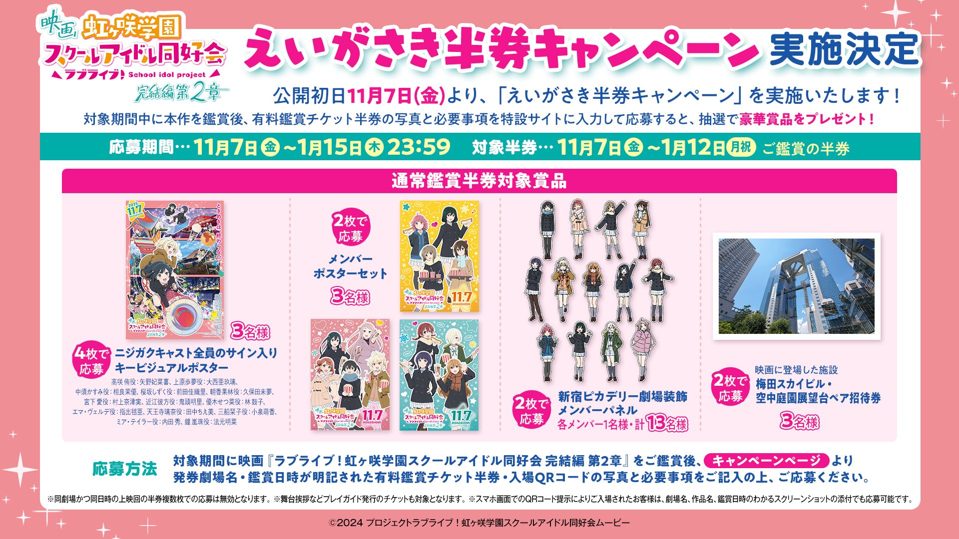 対象期間に映画『ラブライブ︕虹ヶ咲学園スクールアイドル同好会 完結編 第2章』をご鑑賞後、キャンペーンページより発券劇場名・鑑賞日時が明記された有料鑑賞チケット半券・入場QRコードの写真と必要事項をご記入の上、ご応募ください。
